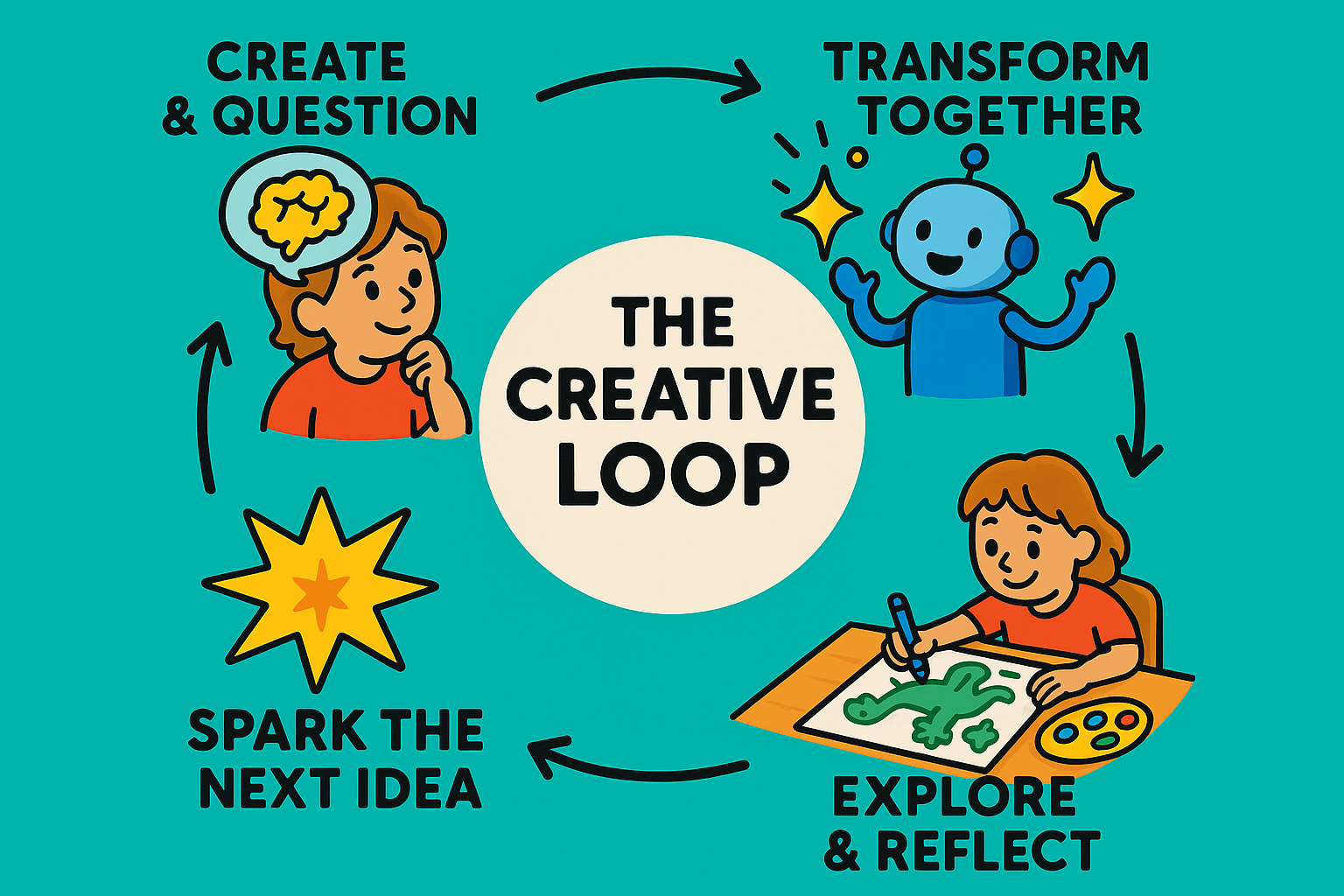 Our experiences all follow a simple rhythm: start with an idea or question, transform it together using AI, explore it through hands-on activities, then let reflection ignite the next adventure.